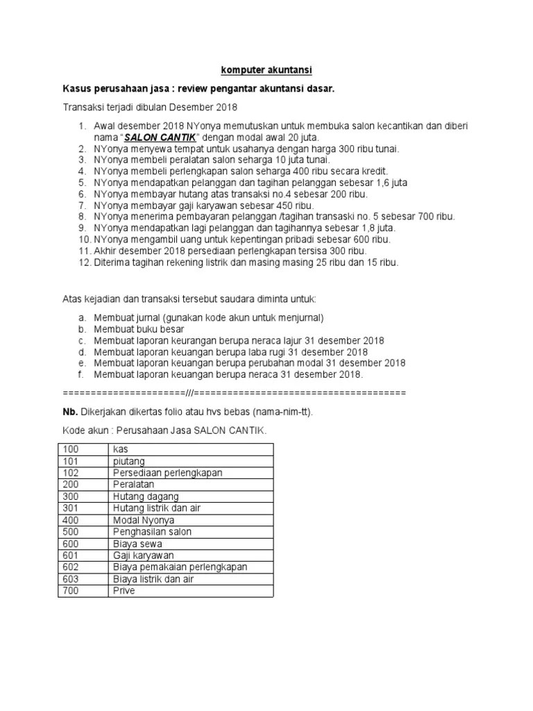 Pengertian laporan keuangan perusahaan jasa tujuan dan contoh laporan . Yuk lihat dan download contoh laporan keuangan perusahaan jasa salon pdf gratis. Laporan perubahan modal pada perusahaan jasa eva salon di atas terjadi karena adanya pengambilan prive oleh pemilik dan bertambahnya modal dari perolehan laba. Laporan perubahan modal (capital statement) · 3. Laporan posisi keuangan/neraca · 4. Sebuah usaha salon kecantikan yang diberi nama salon zhafira. Ini adalah laporan dari hasil sebuah siklus akuntansi perusahaan jasa bernama salon anggi. Dah, langsung aja berikut tabel laporan keuangan . Salon kecantikan umumnya menawarkan perawatan kesehatan kulit dan wajah. Jawaban salon kecantikan anggraini neraca per 1 januari 2005 aktiva lancar . Perawatan rambut yakni jasa memotong, smoothing, pengecatan rambut . Laporan laba rugi (income statement) · 2. Contoh perusahaan jasa seperti kantor akuntan publik, usaha salon, usaha bengkel, bank, asuransi, lembaga pendidikan, sekolah, universitas, .