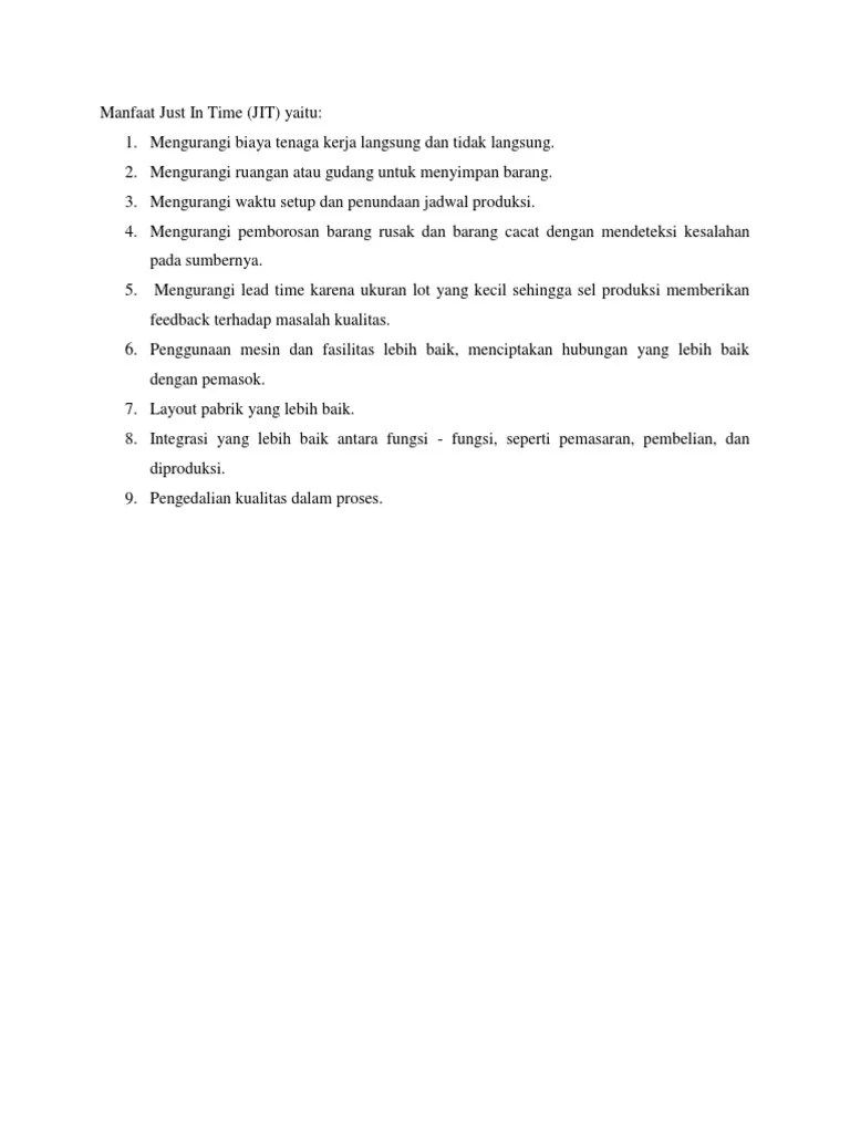 Pengurangan setup time masa pengesetan mesin (setup time) adalah waktu yang dibutuhkan untuk mengubah perlengkapan, memindahkan bahan baku, dan mendapatkan formulir terkait dan bergerak cepat untuk mengakomodasikan produk unsure yang berbeda. Just in time dan backflushing. Contoh soal dan jawaban just in time.just in time merupakan filosofi pemanufakturan yang memiliki implikasi penting dalam manajemen biaya. Jit kemudian memfokuskan pada eliminasi pemborosan dengan menekan waktu dan ruang, keberhasilan implementasi jit membawa perbaikan secara signifikan seperti kualitas yang lebih baik, meningkatkan produktivitas, mengurangi tenggang waktu, mengurangi sebagian besar per. See full list on kelasips.com See full list on kelasips.com Mercedes benz menawarkan kontrak tahu. Arus lini jalur fisik yang dilewati oleh sebuah produk pada saat bergerak melalui proses pabrikasi dari penerimaan bahan baku sampai ke pengiriman barang jadi. Restoran ini memiliki produktivitas yang sangat tinggi di jepang. Tarikan permintaan produk adalah melalui proses produksi. Sistem manajemen fungsional untuk mempromosikan pengendalian mutu ke seluruh bagian perusahaan. Pembenahan tata letak pabrik 3. Sistem kanban untuk mempertahankan produksi just in time (jit).